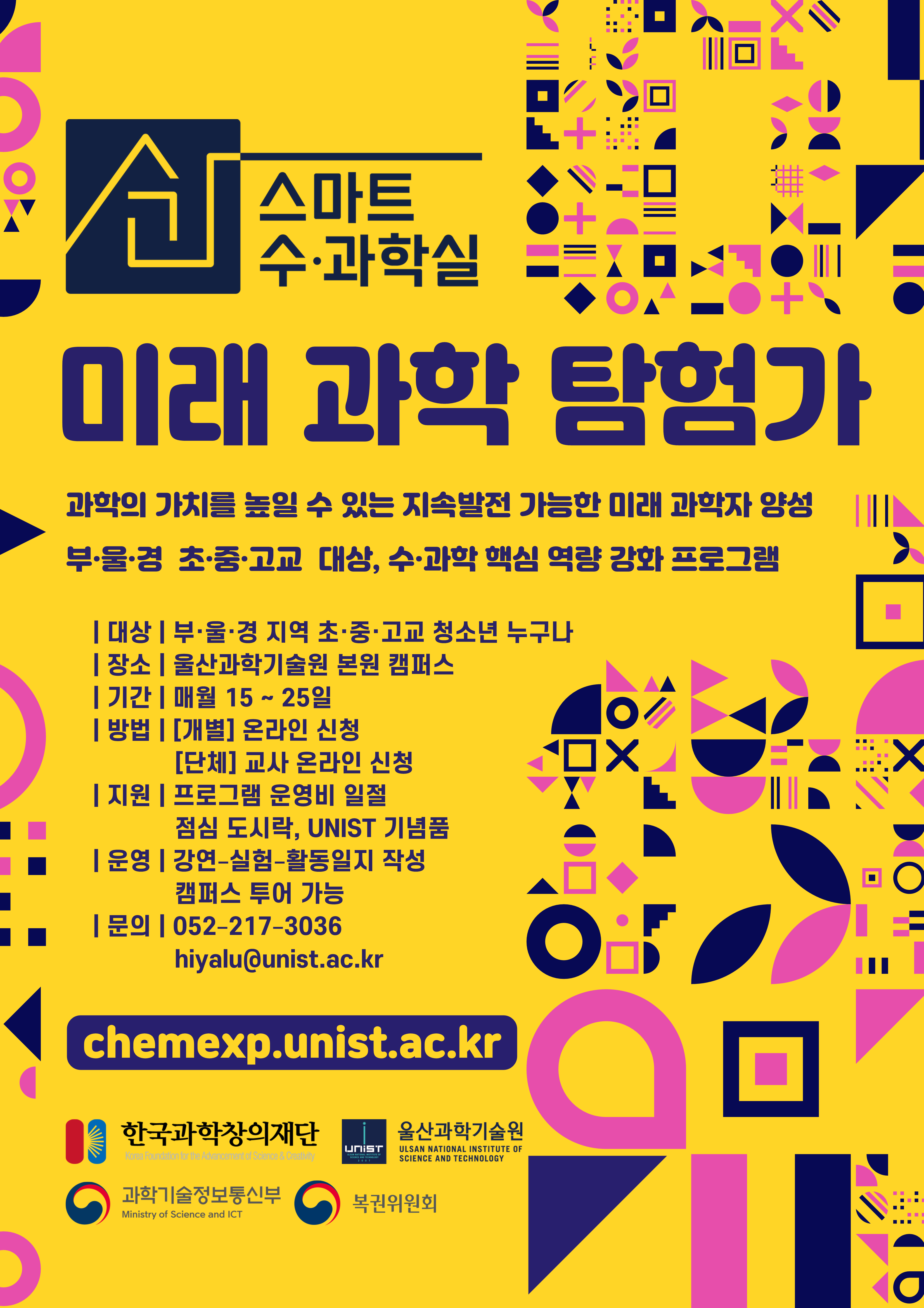 가. 프로그램명: 2023 UNIST×스마트 수과학실 / 미래 과학 탐험가 나. 운영목표: 과학의 가치를 높일 수 있는 지속발전 가능한 미래 과학자 양성 다. 참가대상: 부산, 울산, 경남지역 초·중·고교 청소년 누구나 라. 신청방법: - UNIST×스마트 수·과학실 홈페이지를 통해 개인 또는 단체 신청 - 홈페이지: chemexp.unist.ac.kr - 프로그램 참여 신청은 회원가입 후 진행 가능 마. 신청기간: 매달 15일 ~ 25일 바. 결과발표: 매달 30일 예정, 홈페이지 및 개별 이메일/문자 통보 사. 운영 프로그램: 1) (초등) 고체 액체 상태 분리 분석, 식물의 색소 추출, 카멜레온 구슬 만들기, 물 담는 십자가 만들기, 종이 원심분리기 만들기 2) (중등) 선 스펙트럼 관찰, 미시 세계의 여행, UNIST 가막못 맑은 물 이야기, 내 다리 튼튼 3) (고등) [모범 화학실험] 전기화학, 액체 산소의 자기적 성질, 고분자 화합물 합성, 커피 로스팅 및 크로마토그래피 [탄소중립] 계산화학, 염료감응 태양전지, 풍력발전기 만들기, 슬기로운 난방 생활, 노아의 방주(해상 스마트시티) 만들기 아. 문의처: 담당교수 진근영 / 052-217-3036 / hiyalu@unist.ac.kr