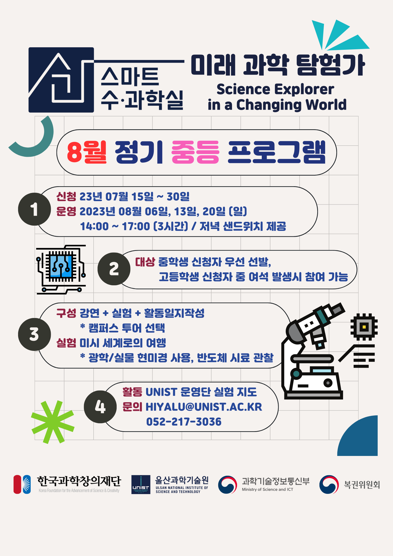 □ 목표 - 과학의 가치를 높일 수 있는 지속발전 가능한 미래 과학자 양성 □ 장소 및 대상 - 장소: 울산과학기술원 본원 캠퍼스 - 대상: 부산, 울산, 경남 지역 초·중·고교 청소년 누구나 □ 신청 방법 - UNIST×스마트 수·과학실 홈페이지를 통해 개인 또는 단체 신청 - 홈페이지: chemexp.unist.ac.kr - 프로그램 참여 신청은 회원가입 후 진행 가능 □ 신청 기간 - 신청기간: 2023.07.15.(토) ~ 07.30.(일) - 결과발표: 2023.08.02.(수) 홈페이지 및 개별 이메일/문자 통보