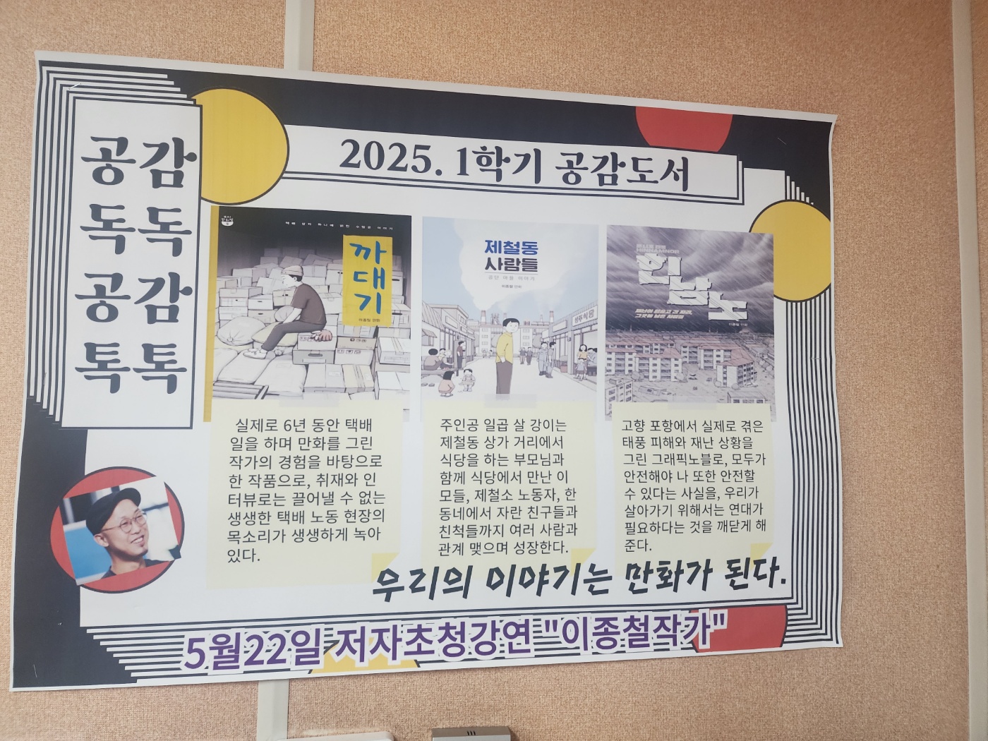 용원중학교, 인문소양교육 프로그램 ‘공감독독, 공감톡톡’ 의 일환으로 ‘제철동 사람들’의 이종철 작가 초청 강연회 열다 용원중학교(교장 조미숙)는 2025년 5월 22일(목), 인문소양교육 프로그램 ‘공감독독, 공감톡톡’의 일환으로 저자 초청 강연회를 성공적으로 개최했다. 이번 행사는 1, 3학년 교육과정과 연계해 진행되었으며, 학생들의 독서 동기 부여와 문학적 소양 함양을 목표로 마련됐다. 이번 강연에는 만화 <까대기>, <힌남노>, <제철동 사람들>의 저자 이종철 작가가 초청되어 ‘우리의 이야기가 만화가 된다’라는 주제로 학생들과 만났다. 시청각실에서 진행된 현장 강연에는 독서토론 동아리 ‘다움솔’ 회원 및 독후활동 우수자 등 100명 이내의 학생들이 직접 참여했으며, 강연 내용은 방송을 통해 전교생에게 실시간 송출됐다. 행사에 앞서 학생들은 국어 시간 ‘한 책 읽기’ 수업을 통해 지정 도서를 읽고, 모둠별로 ‘공감 메시지’와 가장 인상적인 인물 그리기 등 사전 활동을 진행했다. 작성된 공감 메시지는 학교 곳곳에 전시되어 학생들의 다양한 생각을 공유하는 장이 되었다. 또한, 학생들은 작가에게 궁금한 점을 포스트잇에 적어 행사 전 질문판에 부착하는 등 적극적으로 참여했다. 강연 후에는 질의응답 시간이 마련되어 학생들은 작가와 직접 소통하며 만화가로서의 직업, 만화를 통해 이야기하고 싶은 것, 주인공 이름을 짓게 된 계기, 자신을 돌보는 방법 등에 관해 진솔한 이야기를 나눌 수 있었다. 이번 프로그램은 국어, 영어, 수학, 과학, 사회, 기술가정, 미술, 음악, 체육 등 교과별로 교육과정과 연계한 다양한 독서활동으로 확장됐다. 예를 들어, 학생들은 책 속 인물 소개카드 만들기, 영어 추천문 작성, 최저시급 그래프 그리기, 태풍의 원인 탐구, 노동 환경 토론, 6컷 만화 그리기 등 각 교과의 특성을 살린 활동을 통해 독서의 폭을 넓혔다. 조미숙 교장은 “이번 저자 초청 강연회를 통해 학생들이 책 읽기의 즐거움과 도서관의 새로운 역할을 경험하는 계기가 됐다”며, “지속적인 독서 문화 확산과 평생 독자로서의 자질을 키우는 데 큰 도움이 될 것으로 기대한다”고 밝혔다. 용원중학교는 앞으로도 다양한 문화 체험과 독서 프로그램을 통해 학생들의 인문 소양과 창의적 사고력 신장에 힘쓸 계획이다.