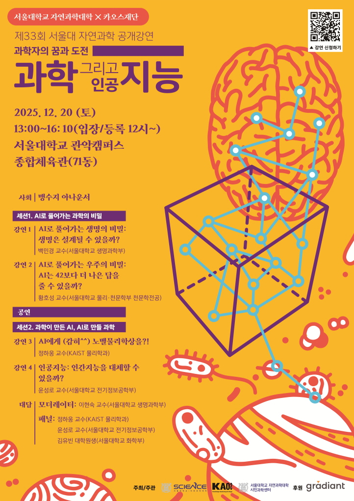 ○ 장소: 서울대학교 관악캠퍼스 종합체육관(71동) ○ 주제: "과학그리고 인공지능"을 주제로 한 강연, 대담, 공연 ○ 신청기간: 2025. 11. 18.(화) 14:00 ~ 선착순 마감