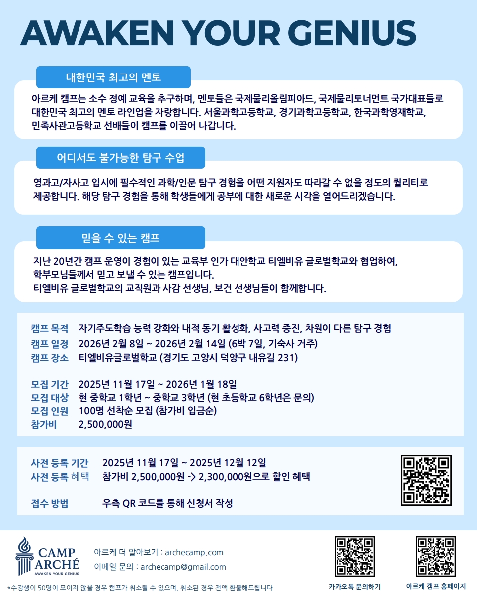 ○ 캠프 목적 : 자기주도학습 능력 강화와 내적 동기 활성화, 사고력 증진, 차원이 다른 탐구경험 ○ 모집 대상 : 2025학년도 중등1 ~ 3학년 ○ 모집 인원 : 100명 선착순 모집(참가비 입금순) ○ 참가비 : 250만원 ○ 사전등록 기간 : 2025년 11월 17일(월) ~ 12월 12일(금) (※ 사전등록혜택 : 참가비 230만원으로 할인 적용)