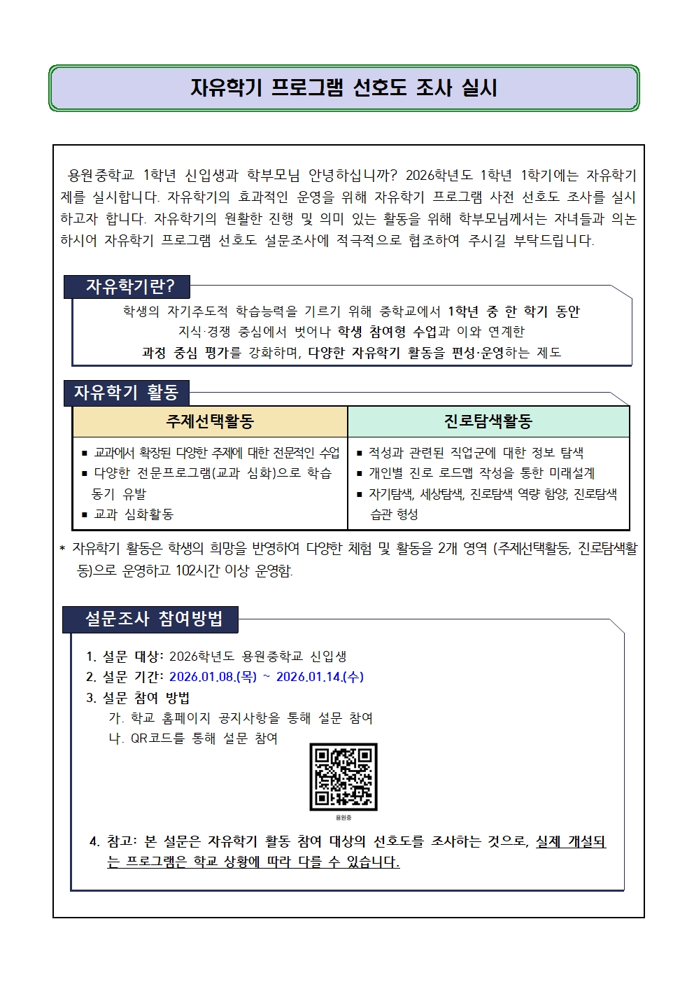 2026학년도 신입생 자유학기 프로그램 사전 선호도 조사 실시